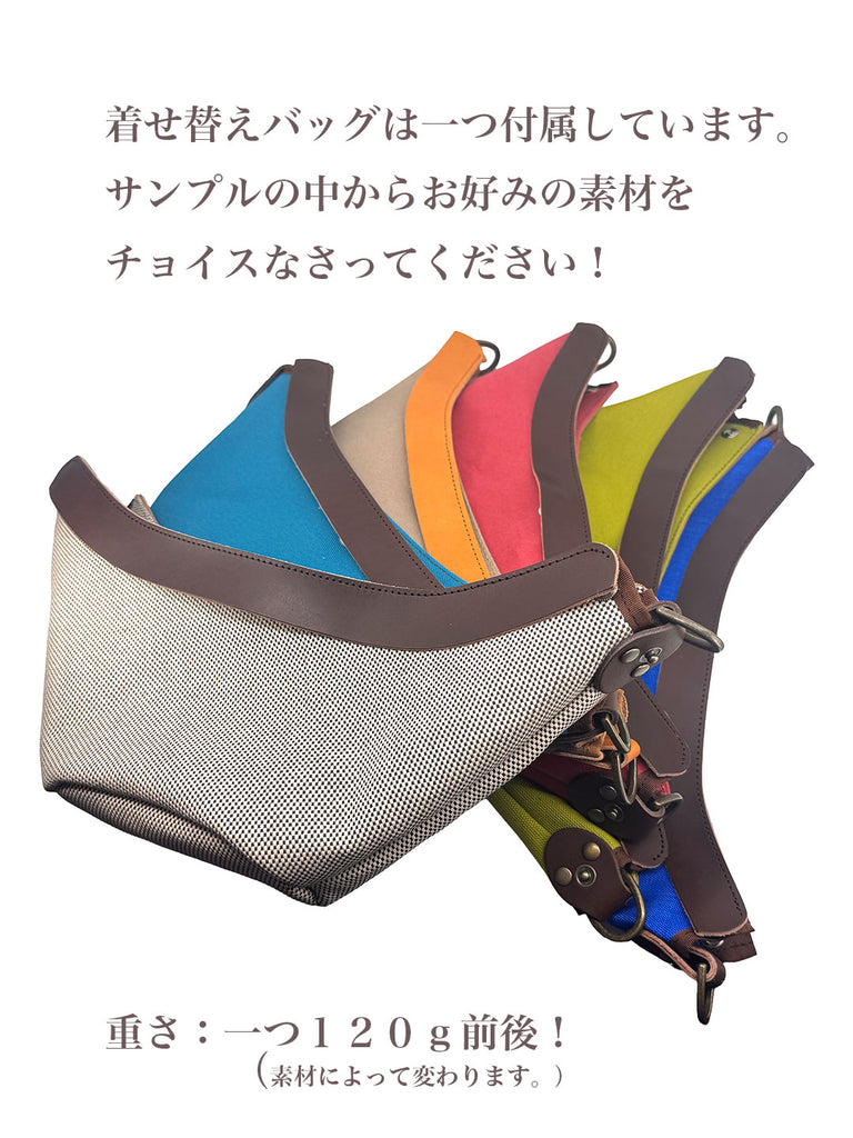 着せ替えバッグ素材:帆布、ナイロン、ビニール素材、ウルトラスエード、様々。
