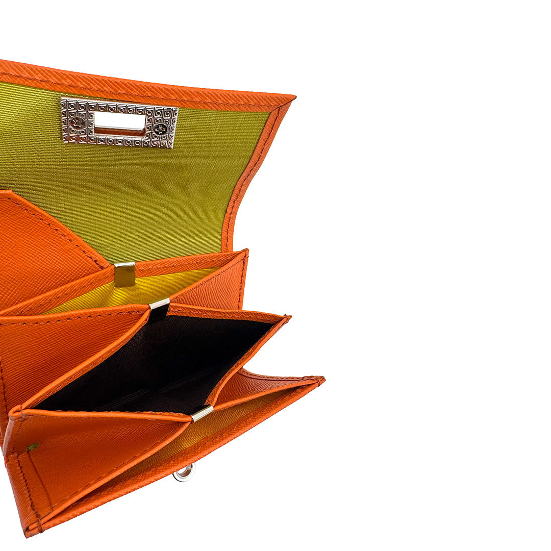 オレンジの型押しレザでお作りしたのTrinityです。店頭に置いていてもカードケースと間違えられる小さなお財布です。